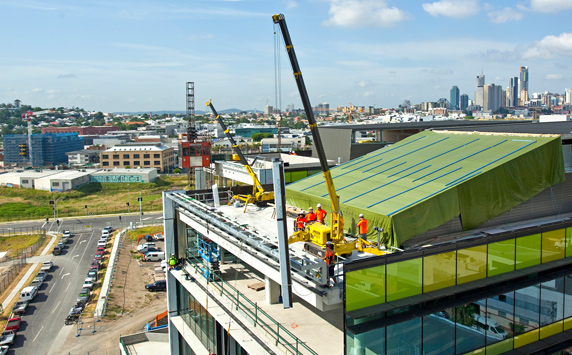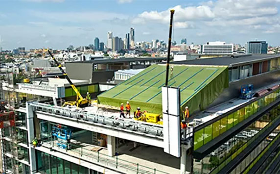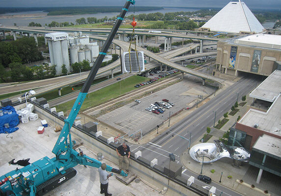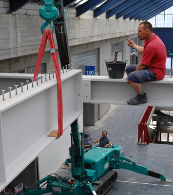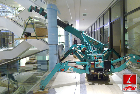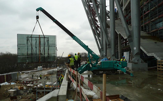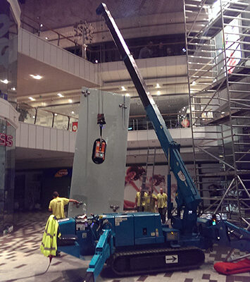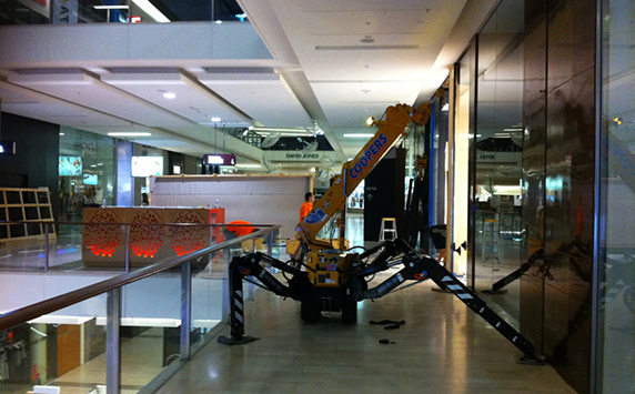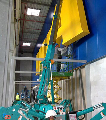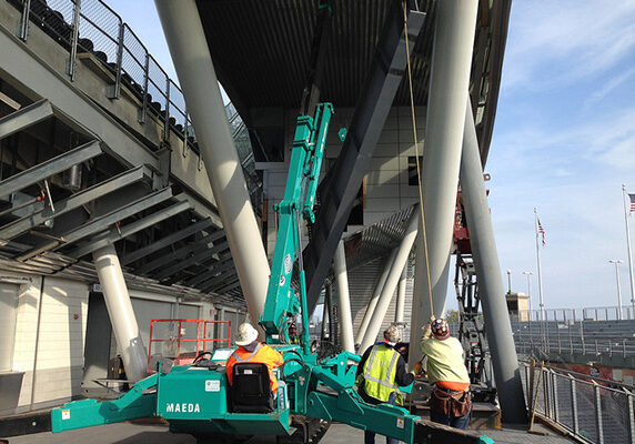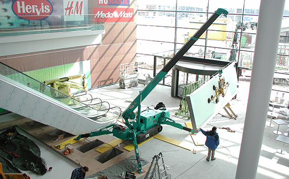 Grâce à leur grande accessibilité, les mini-grues MAEDA sont utilisées pour les travaux d'installation de panneaux d'affichage, d'enseignes et autres dans les grands bâtiments commerciaux tels que les centres commerciaux, les stades et les théâtres.Usages Multiples