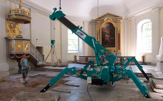 Grâce à leurs chenilles, les mini-grues peuvent accéder aux terrains les plus accidentés. Les grues peuvent être équilibrées en position horizontale grâce aux quatre stabilisateurs, elles peuvent même être utilisées dans des escaliers et sur des sols irréguliers.